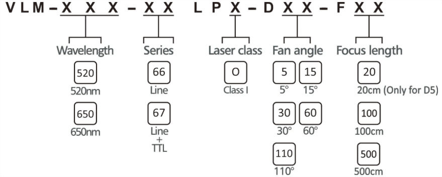 VLM-520/650-66/67 LPO-Dxx-Fyy 520 = green laser 650 = red laser 66 = without TTL modulation 67 = with TTL modulation D= Fan angle xx=5/15/30/60/110 F= Focus length yy=20(Only for D5)/100/500